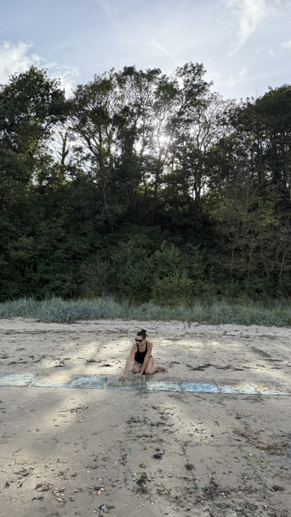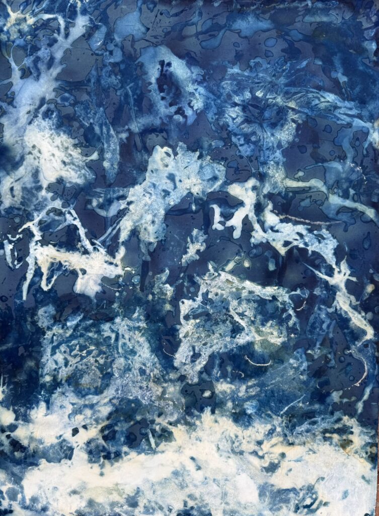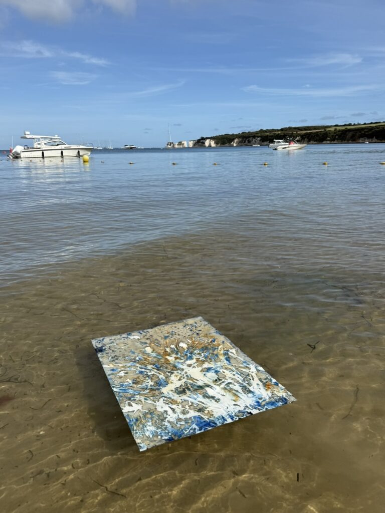 Her process is physically intertwined with the Jurassic Coast. The artworks are taken to the water’s edge and immersed in the sea. They are brushed with sediments and activated by Dorset sunlight. This method allows the environment to complete the process, revealing deep, shifting blues that mirror the energy of the shoreline.